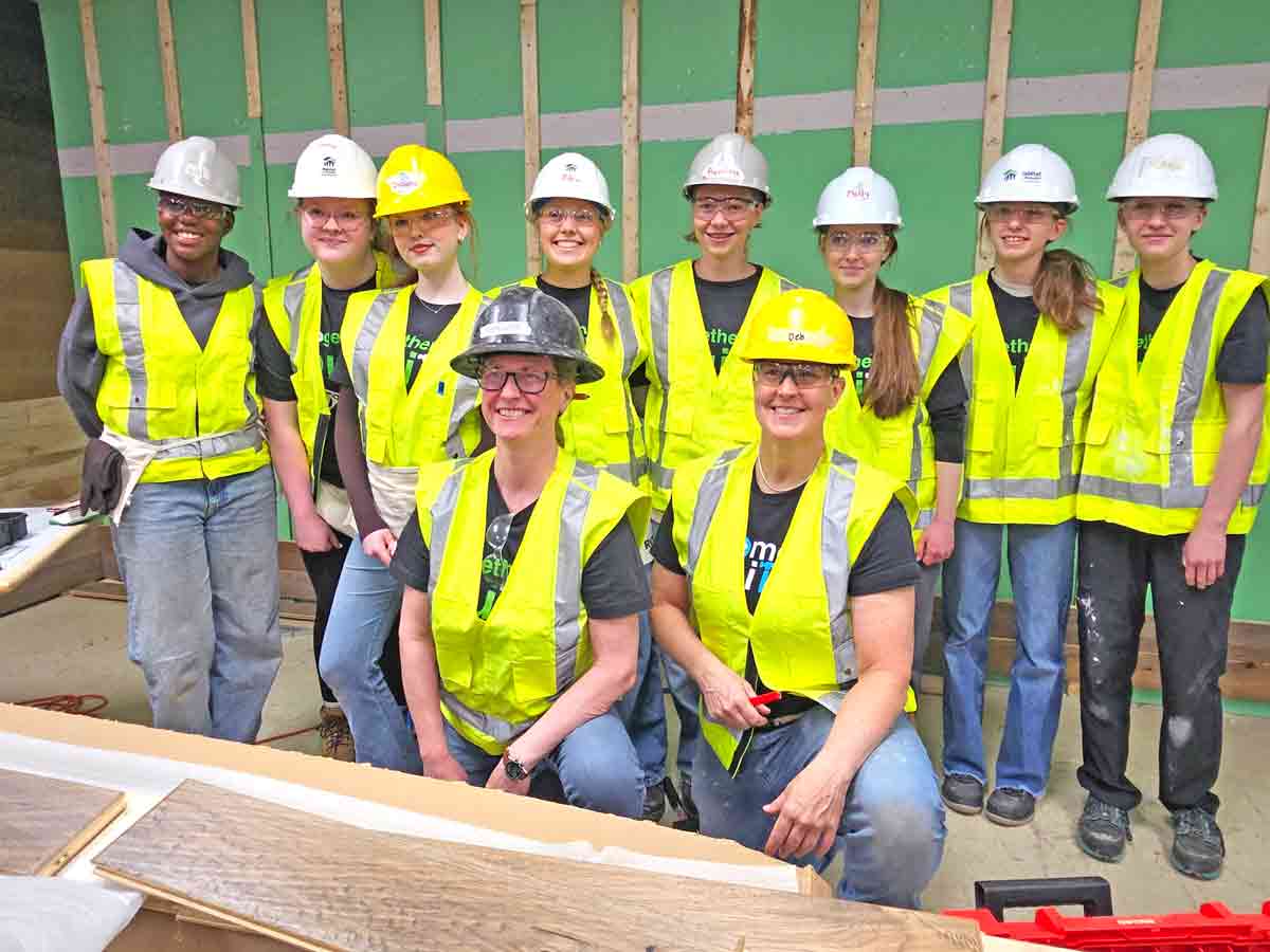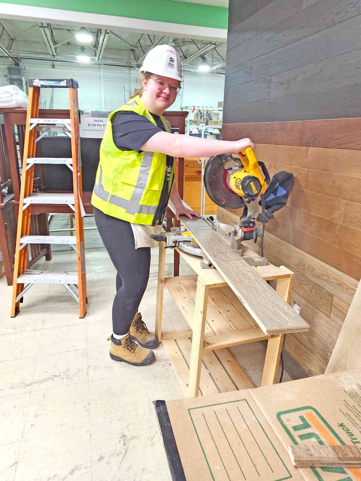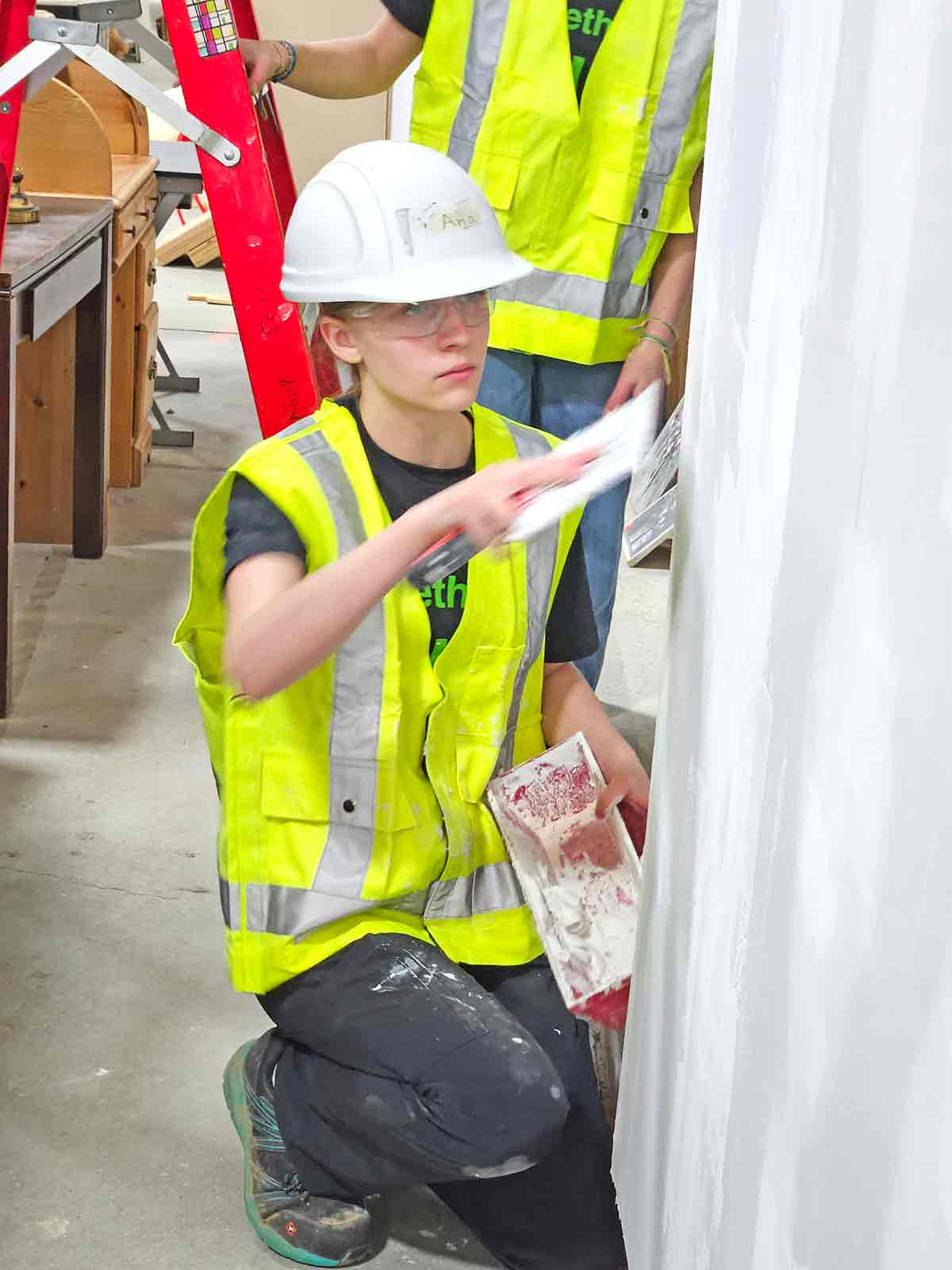 PHOTO 1: Habitat for Humanity Guelph Wellington hosted a skills building day at the Guelph ReStore on April 24 for female students at Guelph Collegiate Vocational Institute. PHOTO 2: Emma Kernoghan used a chop saw for the first time at the skills building day. PHOTO 3: Anastasia Gilroy tries her hand at mudding drywall. Photos by Joanne Shuttleworth