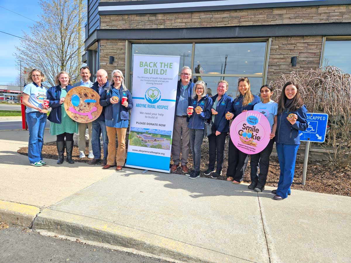 PHOTO 1: The Tim Horton’s Smile Cookie Campaign is underway and proceeds from the three locations in Fergus and the one in Elora are going to the Aboyne Rural Hospice. PHOTO 2: Here owner Peter Moorhead offers cookies to members of the hospice advisory committee, Caroline Skimson, left, Dr. Clarissa Burke, and Hilary Blackett. The campaign runs from April 27 to May 3. Cookies sell for $2 each and 100 per cent of the proceeds go to the charity. Photos by Joanne Shuttleworth