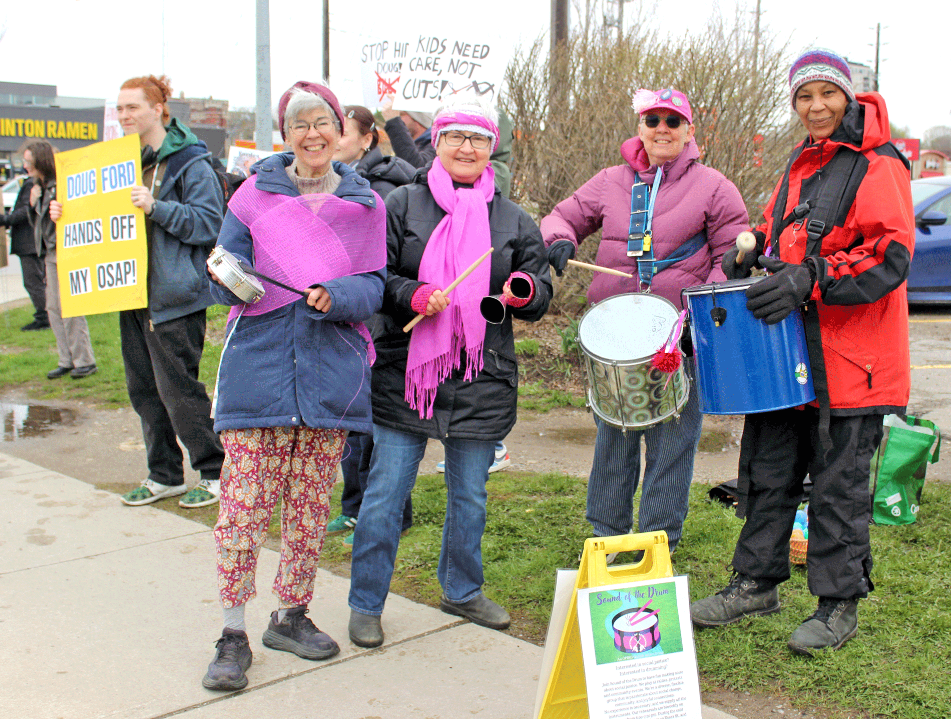 Fight Ford – People gathered in cities across the province on April 25 in a second Fight Ford protest, standing against a range of changes under Premier Doug Ford’s government, including health care, education and development on environmental land. PHOTO 1: Members of Sound of the Drum, an OPIRG action group, showed up to bring some extra noise and energy to the protest. From left, Sheila O’Reilly, Debbie Samson, Patti Phillips and Karen Reid. PHOTO 2: Bob Dawson said he is particularly concerned about changes to the Freedom of Information Act that mean cabinet ministers and their officers are excluded from access to information requests. PHOTO 3: From left: Tyler Nelson, Ken Colquhoun and Ben Dickin. Colquhoun said he came out “to protest Doug Ford and his secrecy,” and said he’s particularly concerned about him “dismantling the FOI act [and] how much he likes Donald Trump.” PHOTO 4: Colleen Burns said she’s particularly concerned about healthcare, and came out “to protest against Doug Ford’s corruption. We’ve had enough – it’s time for him to go. Photos by Robin George