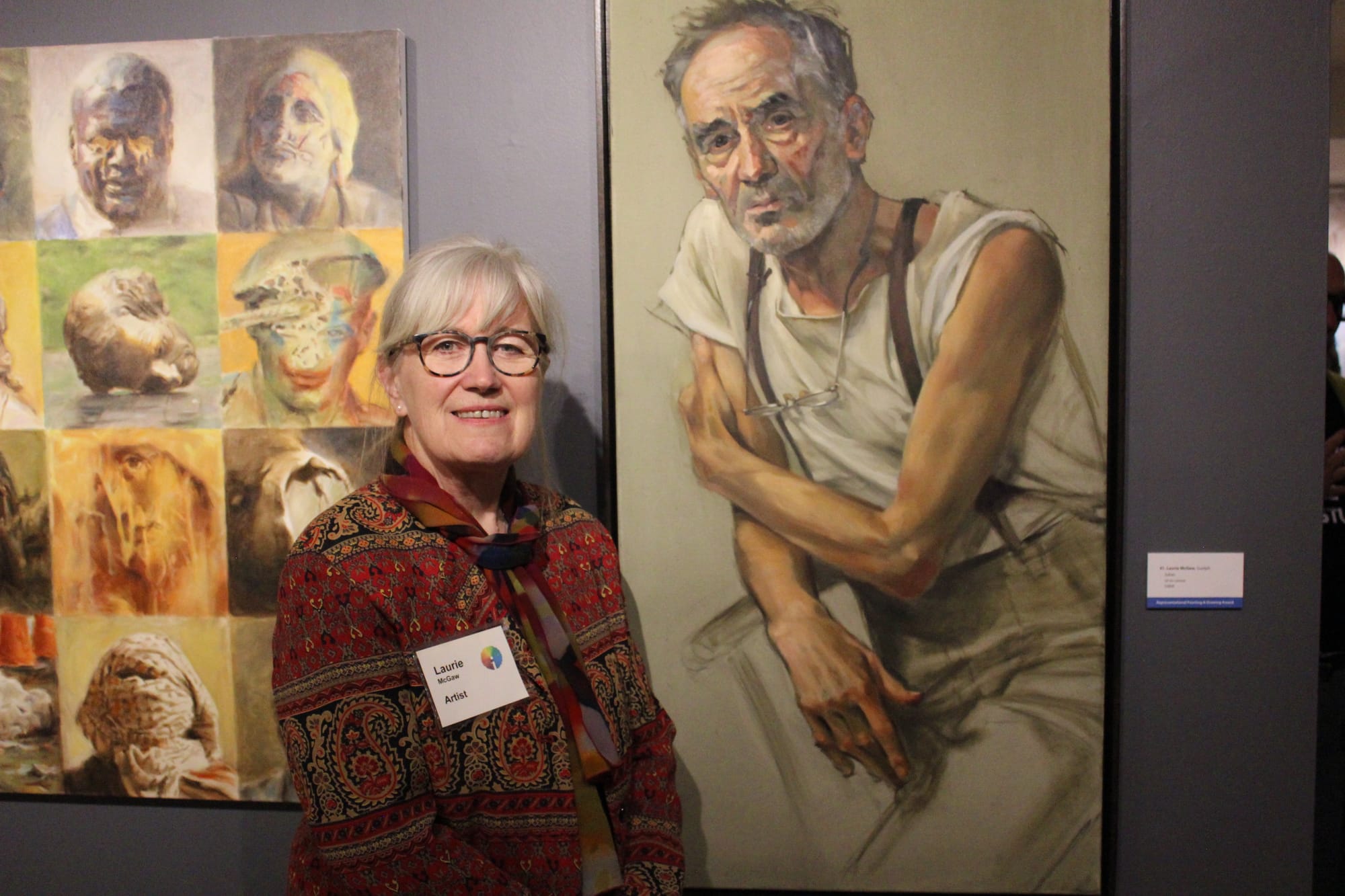 Art show – Jurors walked artists and attendees through the Insights gallery at the Wellington County Museum and Archives on April 22. The gallery will remain on display until June 28. PHOTO 1: Laurie McGaw won the representational painting and drawing award for her oil on canvas, Julian. PHOTO 2: Elora artist Dianne Kennedy Cruttenden’s handwoven tapestry, Off We Go into the Wild Blue Yonder, won the fibre arts award. PHOTO 3: Juror Scott Everingham said A Yellow Leg by Grazyna Adamska-Jarecka won the abstract painting and drawing award in part because the judges were intrigued by the vibrancy, intensity and wide use of pallet. PHOTO 4: Fergus artist Claudia Lambert said her piece, Psychograph, illustrates a journey through art, including both the fun and frustrating parts, and is a reminder to let intuition take over. Photos by Robin George