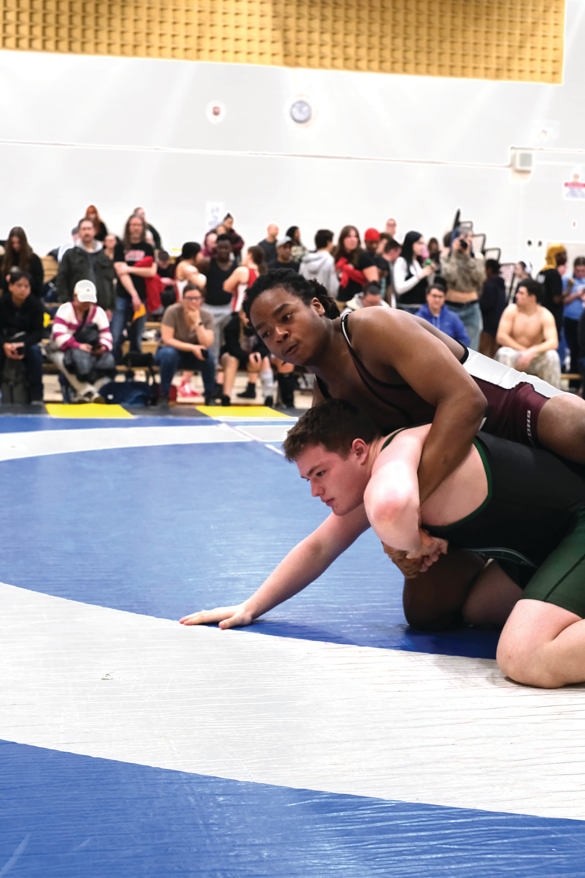 Competition – Centre Wellington District High School (CWDHS) hosted the Central Western Ontario Secondary Schools Association’s (CWOSSA) Wrestling Championship on Feb. 23. CWDHS teacher and wrestling coach Dave Ritter was convenor for the event, his last as he retires. Ritter has convened CWOSSA wrestling matches since 2010. The Fergus high school had eight wrestlers competing for the chance to move on to the Ontario Federation of School Athletic Associations’ (OFSAA) provincial wrestling championship next month in Peterborough. PHOTO 1: Elijah Berry. PHOTO 2: CWDHS teachers and wrestling coaches Dave Ritter, back, and Belinda Cox. PHOTO 3: CWDHS Grade 11 student Maxim Kisselev, right, finished second and qualified for the OFSAA championship.