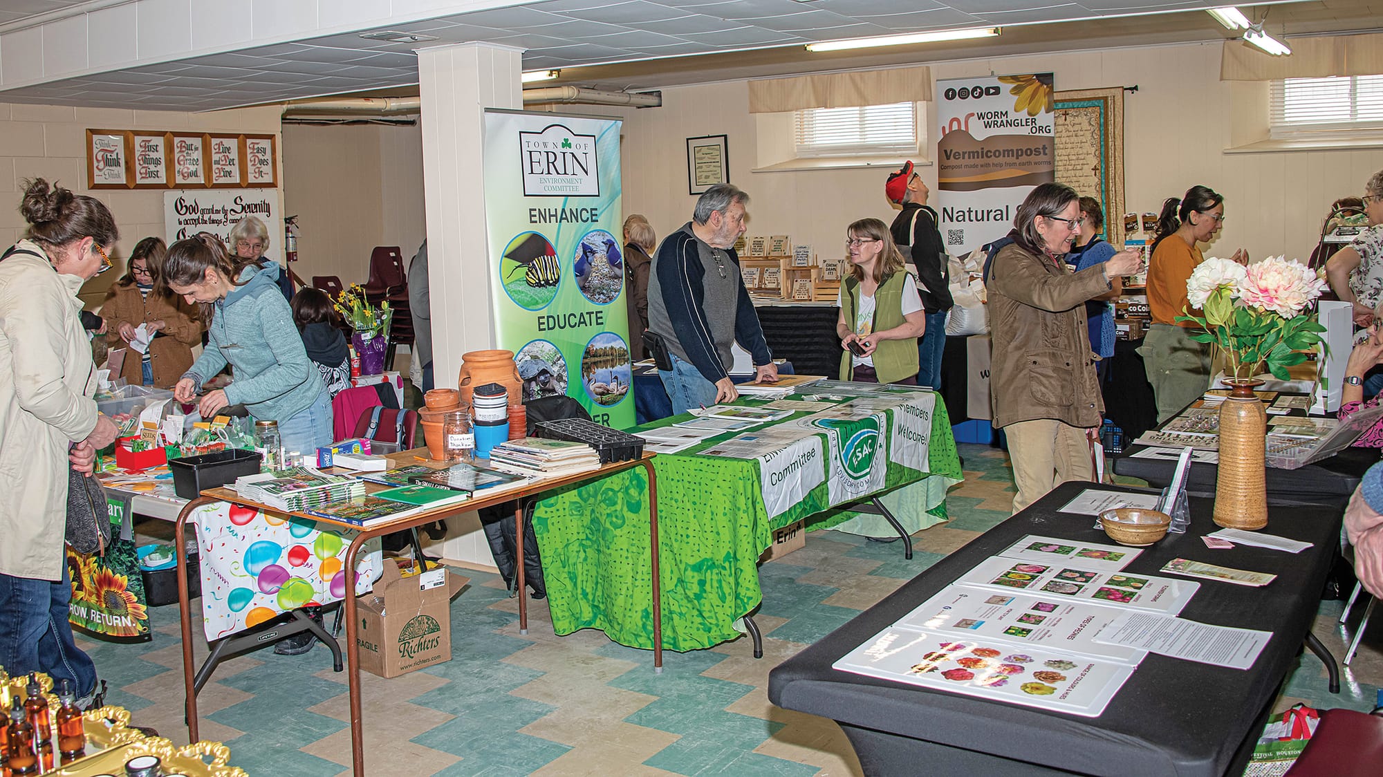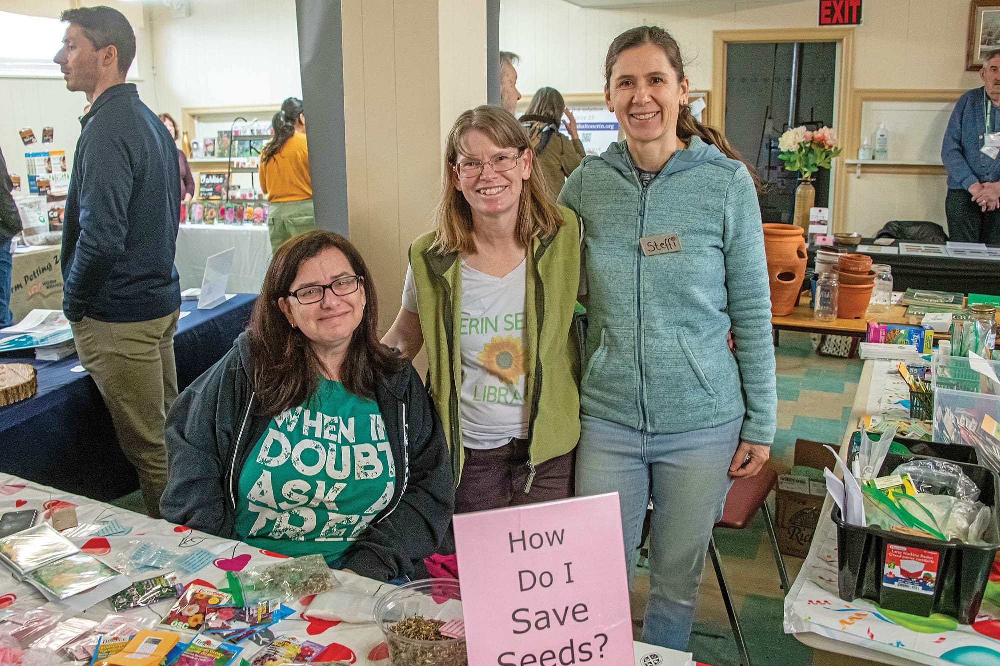 Seedy Saturday – Spring was in the air on March 7 during Erin Seedy Saturday at Erin United Church. The event offered to gardeners flower and vegetable seeds from vendors and from the Erin seed library, and it featured kids crafts, a bake sale and advice from local clubs. PHOTO 1: Town of Erin councillor John Brennan and event organizer Jen Edwards. PHOTO 2: Guests and onlookers took their time browsing booth and displays. PHOTO 3: From left, Hillsburgh Horticultural Society volunteers Cyndy Anderson, Barb Switzer, Michelle Black and president Connie Bienia. Photos by Tristan Clark