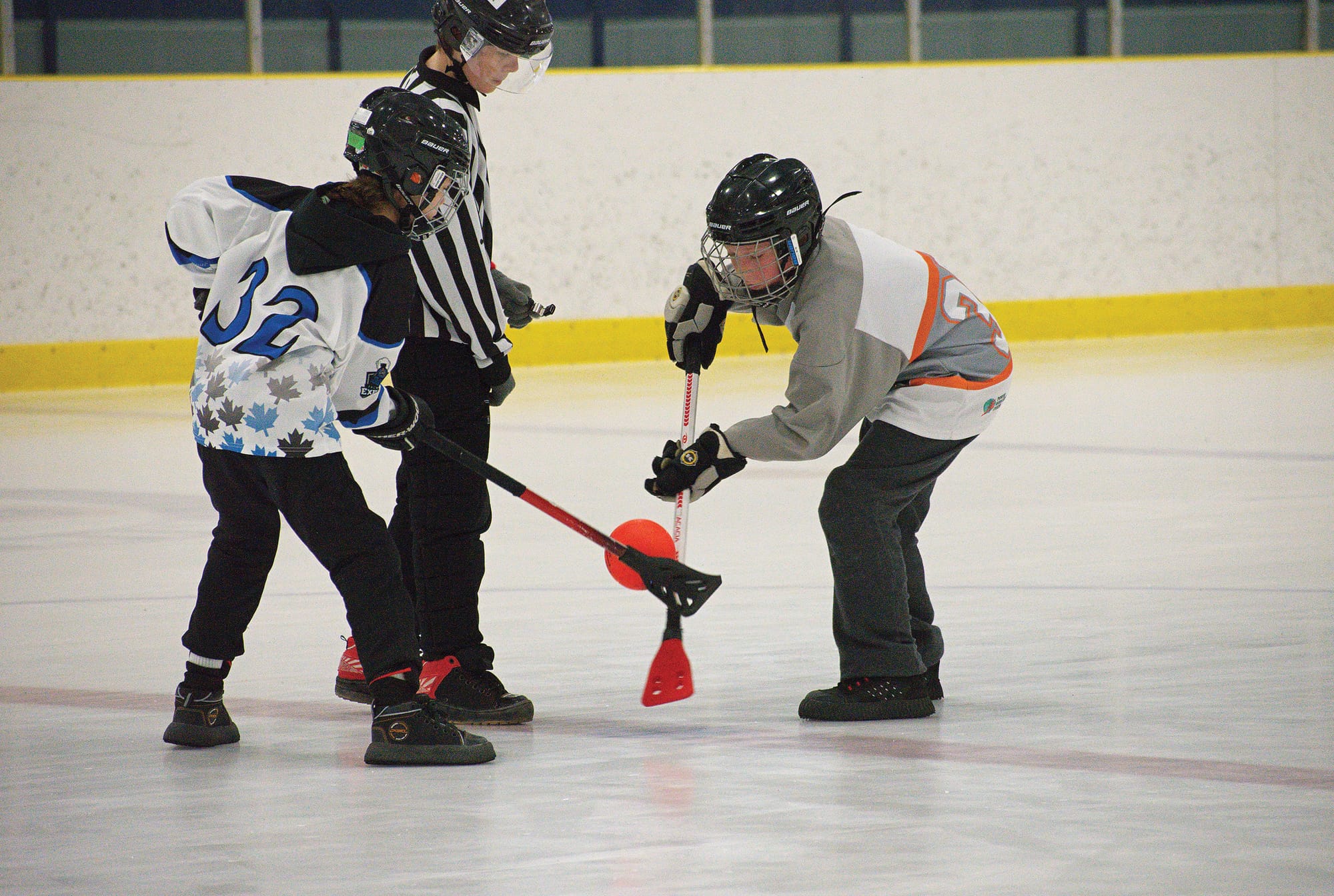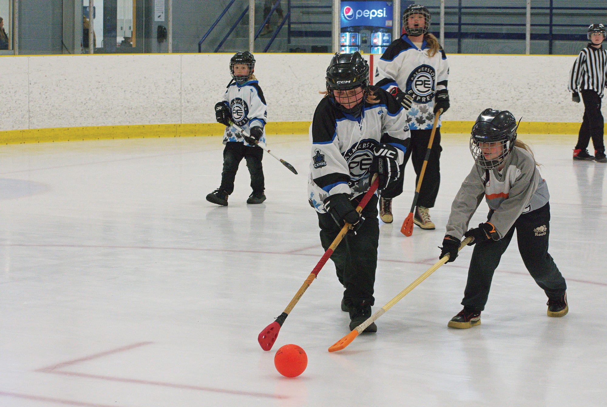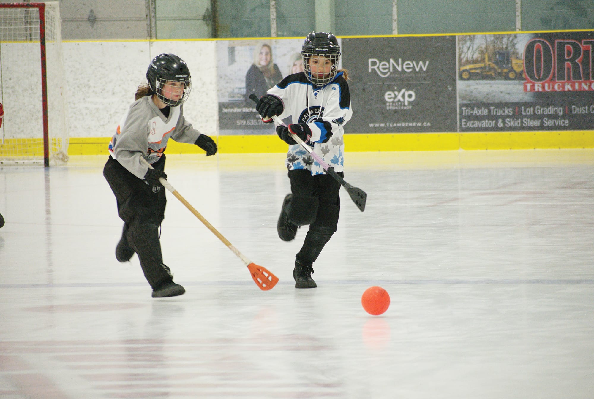 Competition – Youth athletes in four divisions faced off in Palmerston and Harriston over four days during the 18th annual Palmerston Junior Broomball Tournament that ran March 5 to 8. PHOTO 1: Palmerston White Express U12 player Etta Barlett, left, faces off against a Blyth Silver player at the Palmerston Arena on March 7. PHOTO 2: Addalyn Kennedy, left, fights for the ball. PHOTO 3: Natalie Decaire, right, chases after the ball. The Palmerston peewee team won in overtime 1-0 against Blyth but lost in the afternoon against the Mildmay Moose, ending the team’s run in the tournament. Photo by Jordan Snobelen