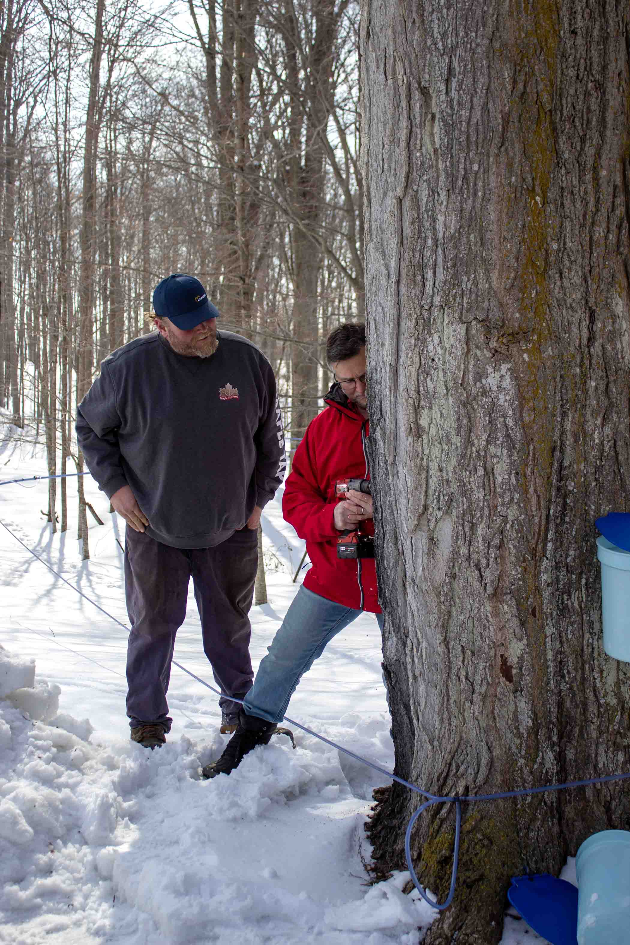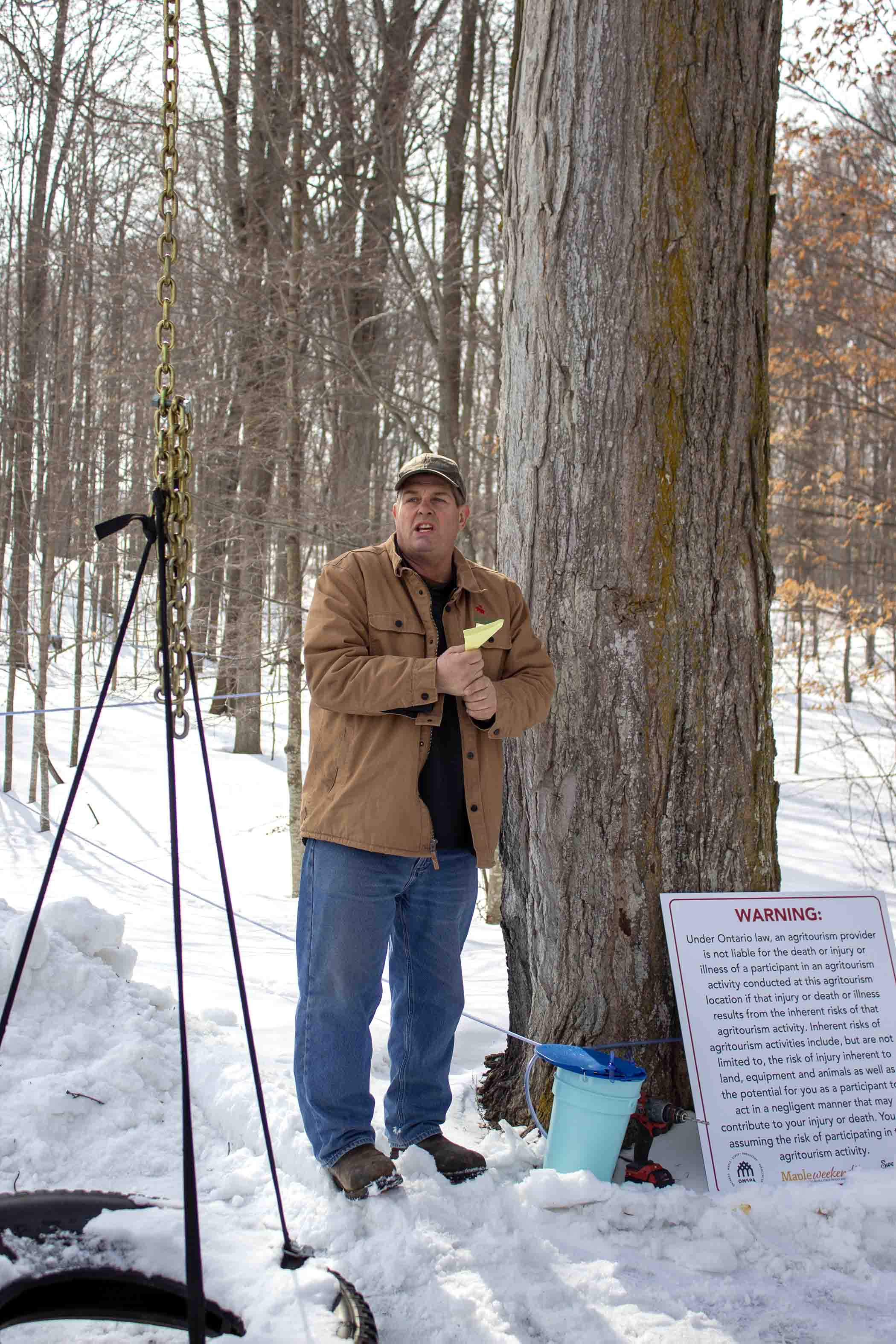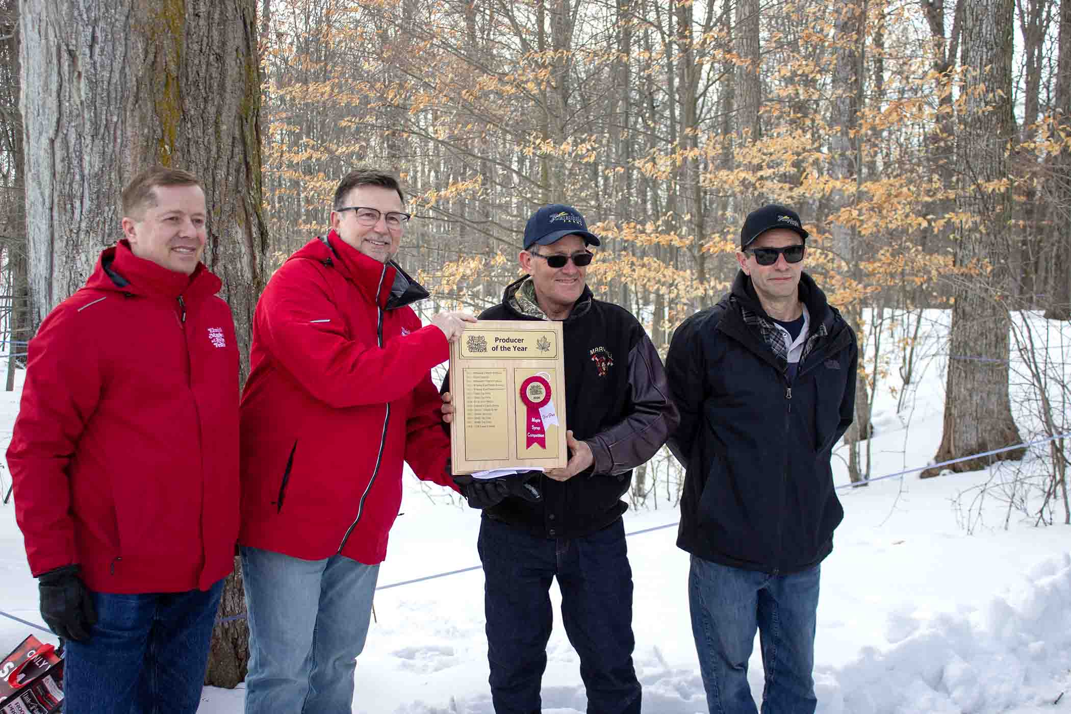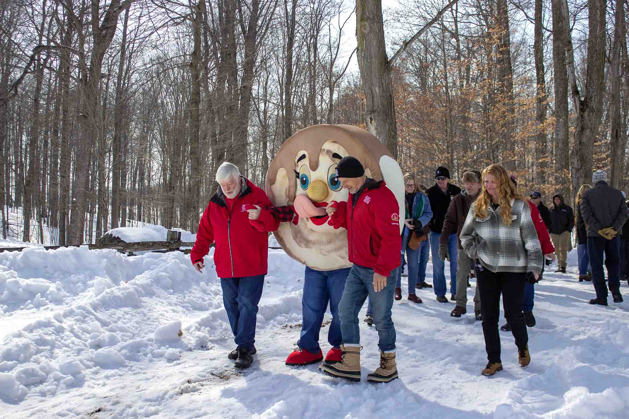 Sugary sweet – The Waterloo Wellington Maple Producers held its annual first tree tapping ceremony for the 2026 maple syrup season at Maple Tree Farm in New Dundee on Feb. 28. PHOTO 1: Maple Tree Farm owner Andrew looks on as Elmira Maple Syrup Festival (EMSF) chairperson Marc McInerney taps a large maple tree. PHOTO 2: EMSF member Caitlin McCabe taps a large maple tree under the watch of farm owner Andrew. PHOTO 3: Gunther Kramer, left, and Elmira Maple Syrup Festival (EMSF) chairperson Marc McInerney, right, presented the EMSF producer of the year award to Tom Snyder of TDS Farms located in Montrose. PHOTO 4: Volunteers worked hard to prepare the free breakfast on offer at the event. Breakfast consisted of pancakes, sausage, coffee and apple cider. PHOTO 5: From left, Marc McInerney (EMSF Chairperson), Dave Unrau, Jeff Hutchinson, Flapjack, Gunther Kramer, Maxine Metzger, Drew McGovern, Caitlin McCabe, Mary Blanchard from the Elmira Maple Syrup Festival pose for a photo. PHOTO 6: Drew McGovern and Jeff Hutchinson assisted the EMSF mascot Flapjack down an icy slope. PHOTO 7: Waterloo Wellington Maple Producers chair person Kevin Snyder addresses the crowd. Photos by Ellouise Thompson