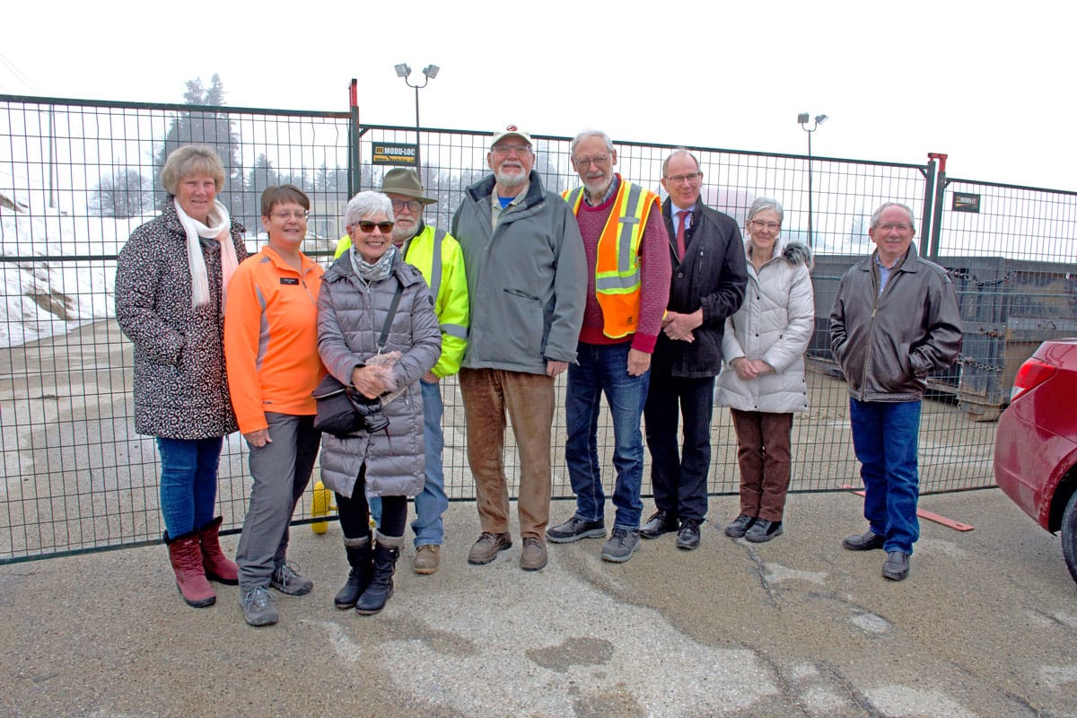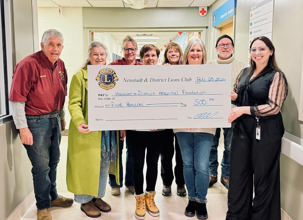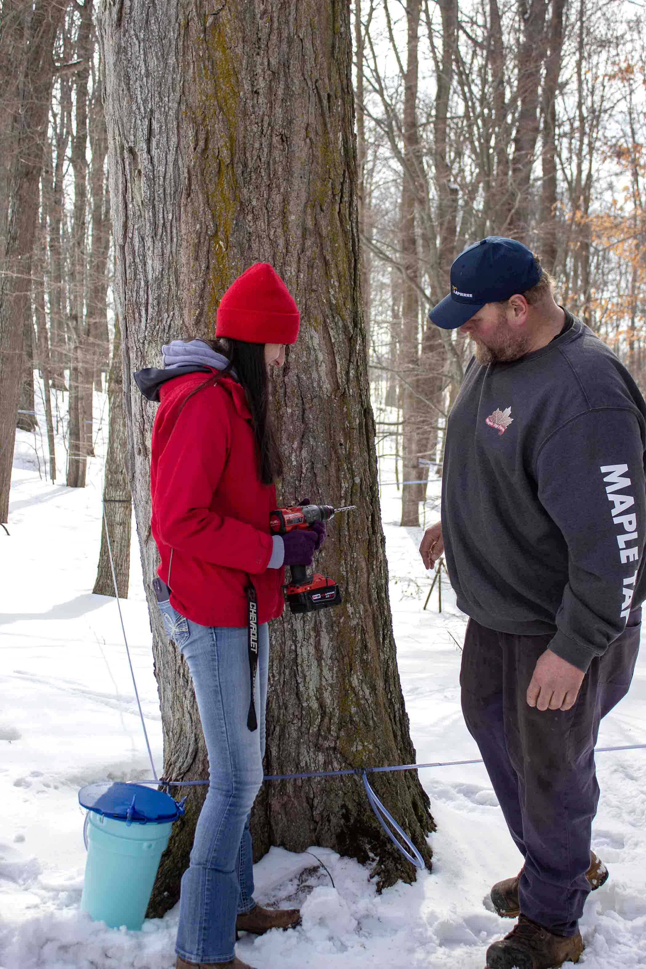 Sugary sweet – The Waterloo Wellington Maple Producers held its annual first tree tapping ceremony for the 2026 maple syrup season at Maple Tree Farm in New Dundee on Feb. 28. PHOTO 1: Maple Tree Farm owner Andrew looks on as Elmira Maple Syrup Festival (EMSF) chairperson Marc McInerney taps a large maple tree. PHOTO 2: EMSF member Caitlin McCabe taps a large maple tree under the watch of farm owner Andrew. PHOTO 3: Gunther Kramer, left, and Elmira Maple Syrup Festival (EMSF) chairperson Marc McInerney, right, presented the EMSF producer of the year award to Tom Snyder of TDS Farms located in Montrose. PHOTO 4: Volunteers worked hard to prepare the free breakfast on offer at the event. Breakfast consisted of pancakes, sausage, coffee and apple cider. PHOTO 5: From left, Marc McInerney (EMSF Chairperson), Dave Unrau, Jeff Hutchinson, Flapjack, Gunther Kramer, Maxine Metzger, Drew McGovern, Caitlin McCabe, Mary Blanchard from the Elmira Maple Syrup Festival pose for a photo. PHOTO 6: Drew McGovern and Jeff Hutchinson assisted the EMSF mascot Flapjack down an icy slope. PHOTO 7: Waterloo Wellington Maple Producers chair person Kevin Snyder addresses the crowd. Photos by Ellouise Thompson