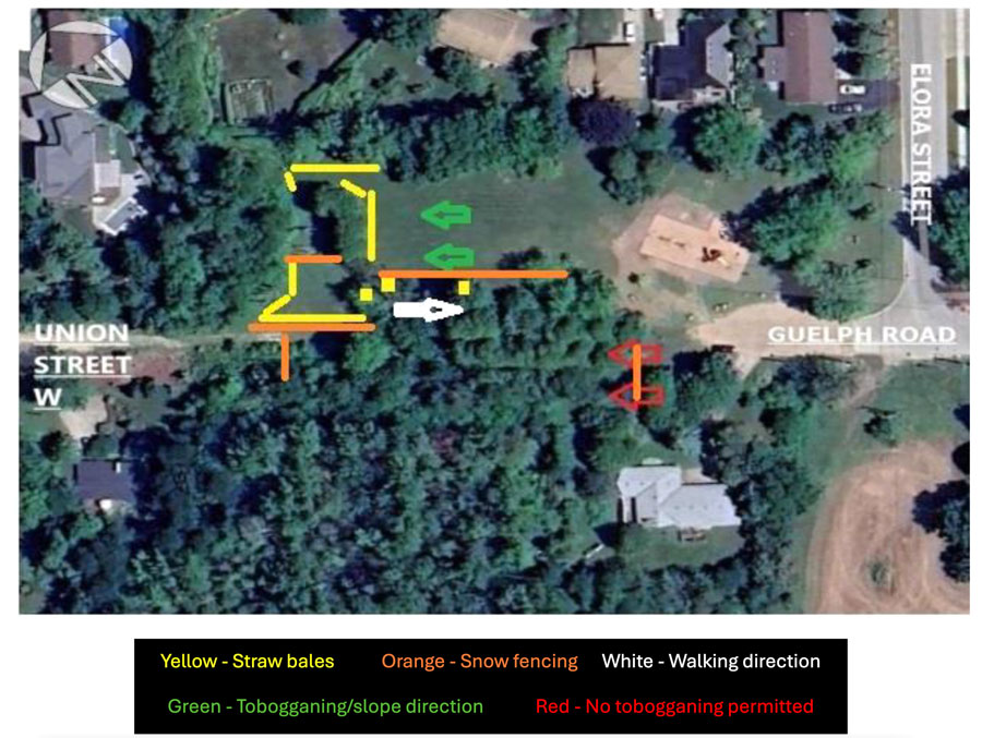 The township has prepared layout drawings for each of its three tobogganning hills. This one at Ferrier Park has the most complicated layout. But snow fencing and straw bales should prevent tobogganers from encountering hazards and make the hills safer, officials say. Image from council agenda