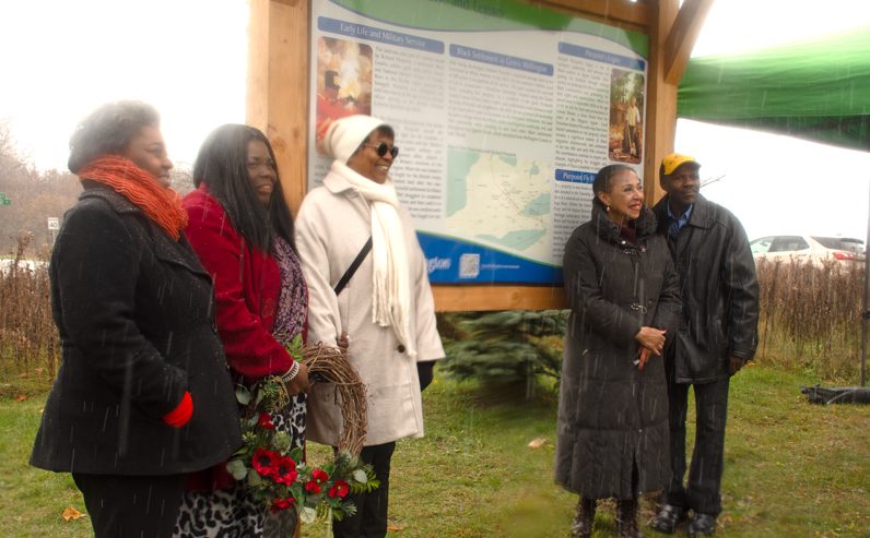 Millicent Gordon set a wreath beside the national plaque that honours Richard Pierpoint. This plaque is opposite the township’s new storyboard.