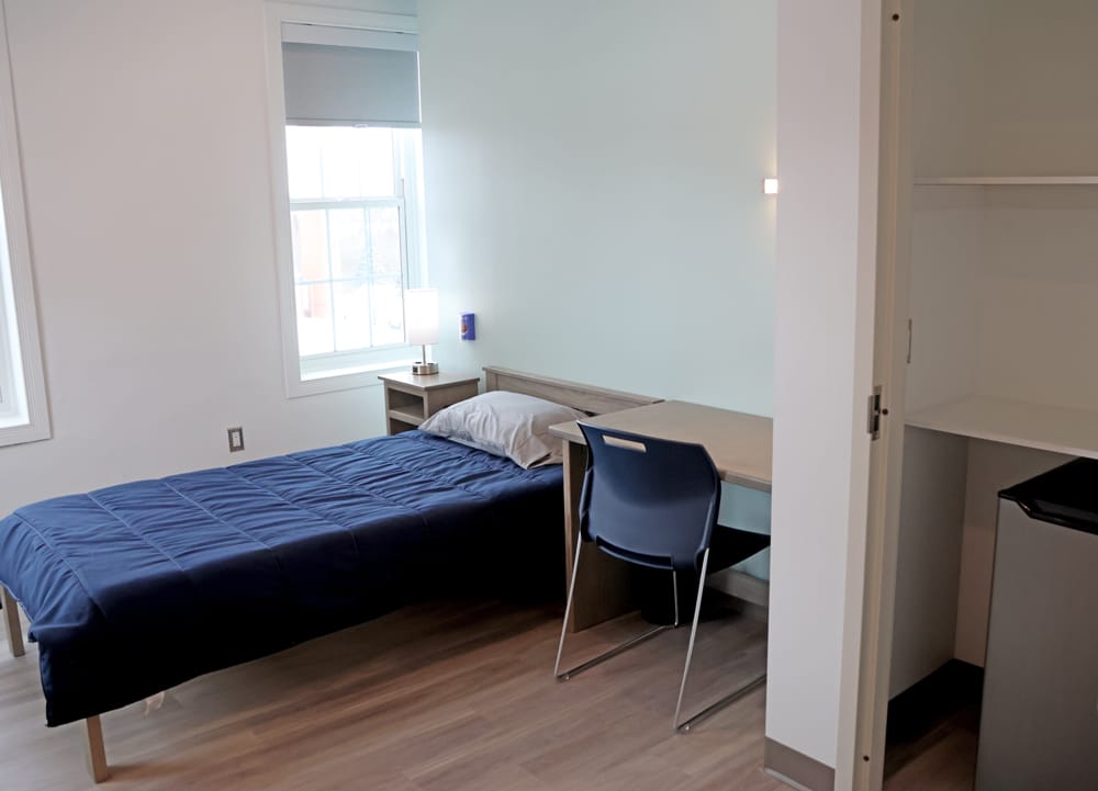The facility includes single rooms – equipped with a bed, desk, lamp, mini fridge and closet – common kitchen facilities and lounges, assessment rooms, and more.