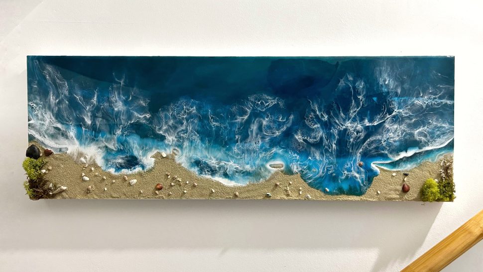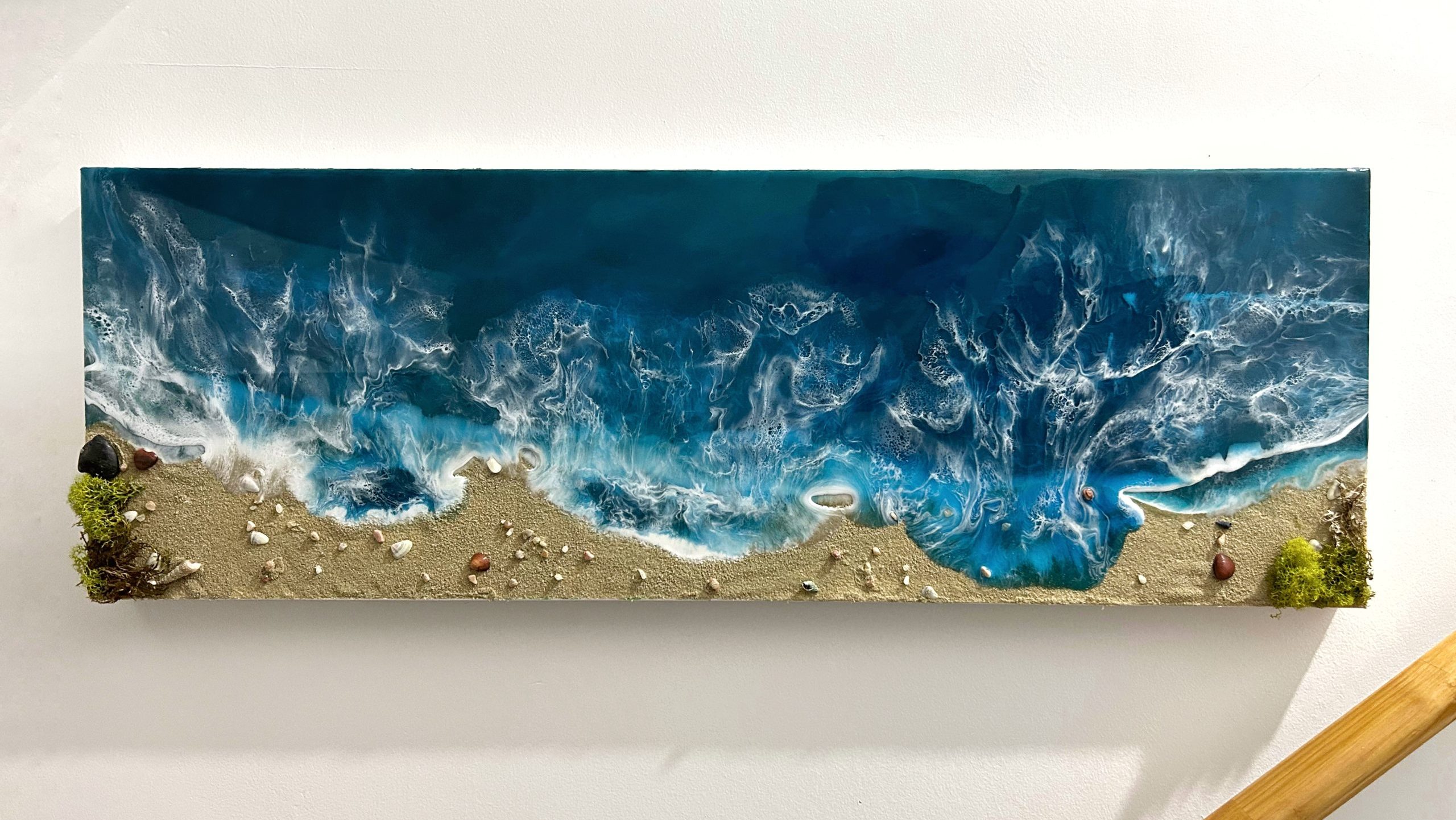 She explained her art as being mixed media as she incorporates real sand, sea shells and tops some of her work with a resin finish.