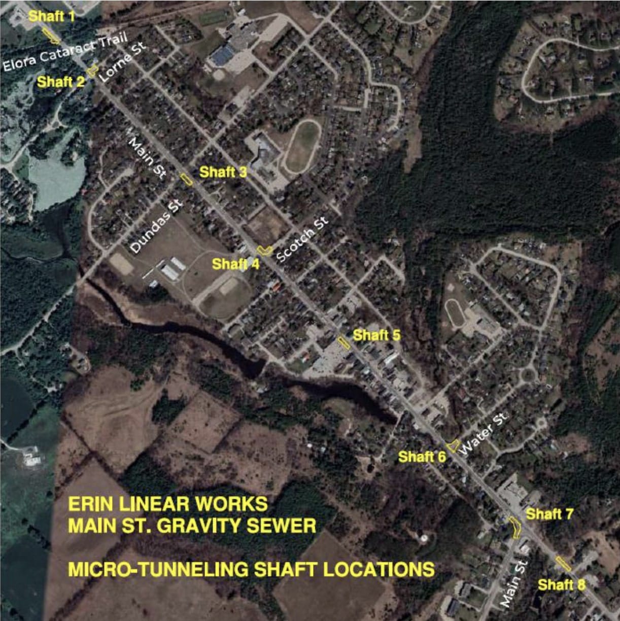 Eight locations along Main Street, where shafts about four metres in diameter will be installed 10 metres deep connecting to the gravity sewer line in Erin Village, will cause some traffic disruption.