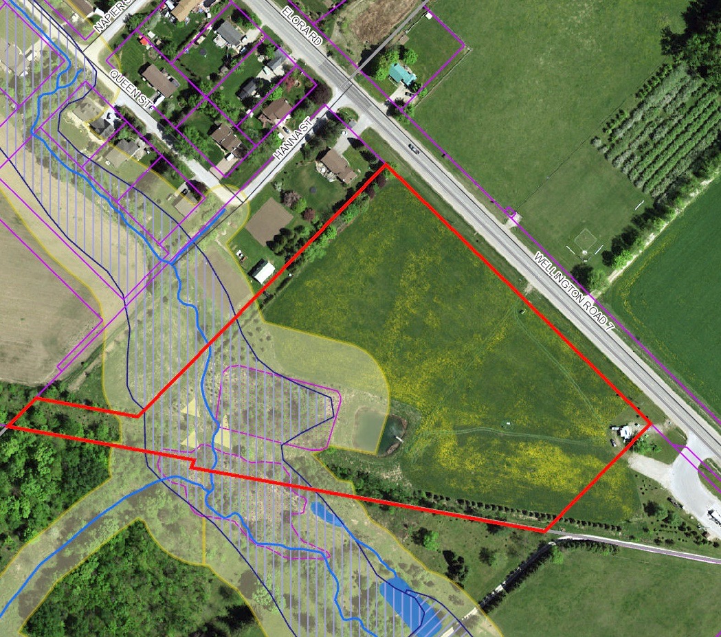 The 9.05 acre site currently contains a 4,800 square foot office building. The applicant also owns the neighbouring site at 6974 Wellington Road 7, which has a Fast Stop gas refuelling station for public use.