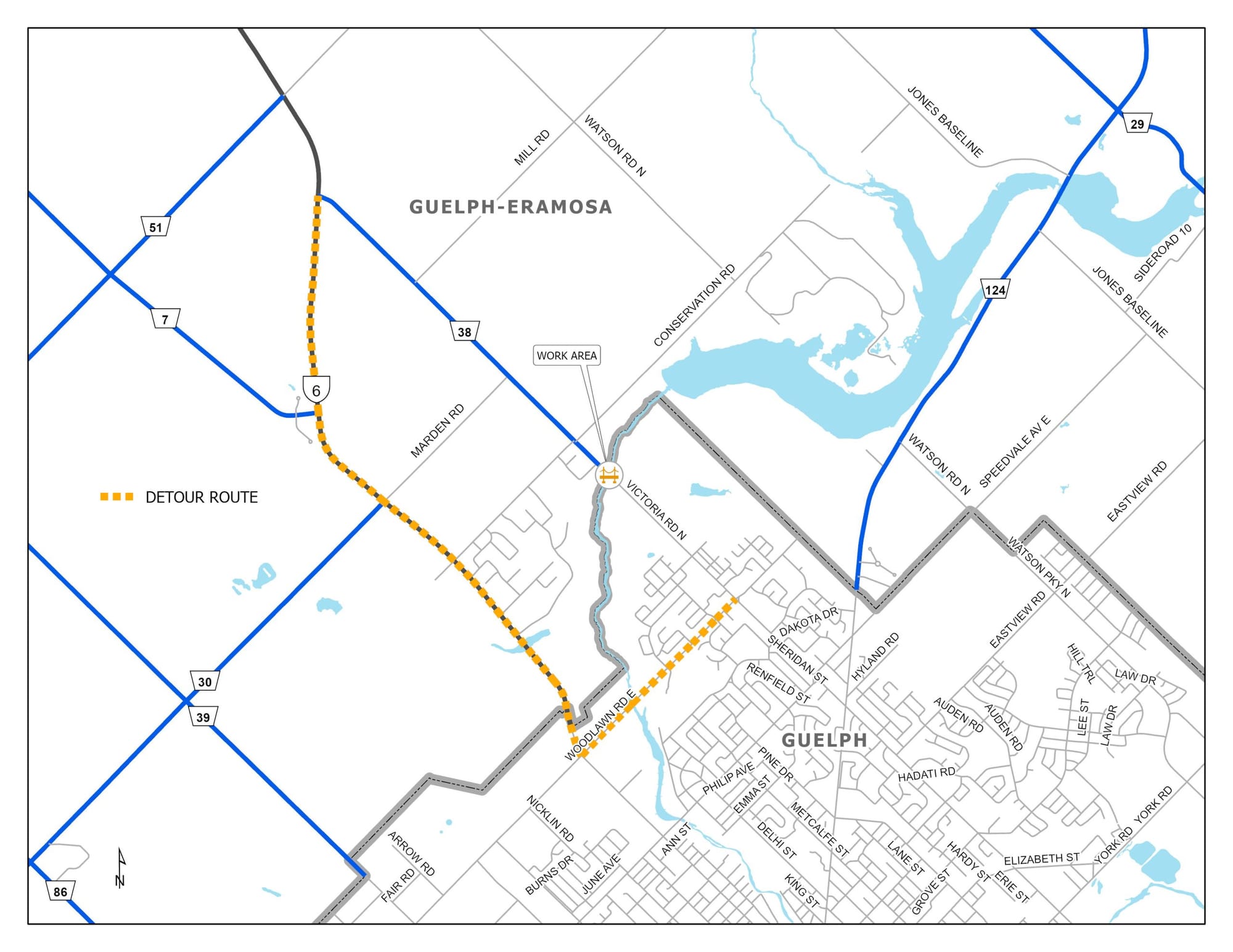 GUELPH/ERAMOSA – Jarlian Construction Inc. is working to rehabilitate a bridge located on Victoria Road North (Wellington Road 38) south of Highway 6 and spanning over the Speed River at the border between the Township of Guelph/Eramosa and the City of Guelph. There will be a road closure from July 28 to /about Sept. 1. A detour route is posted, taking vehicles around the project site.