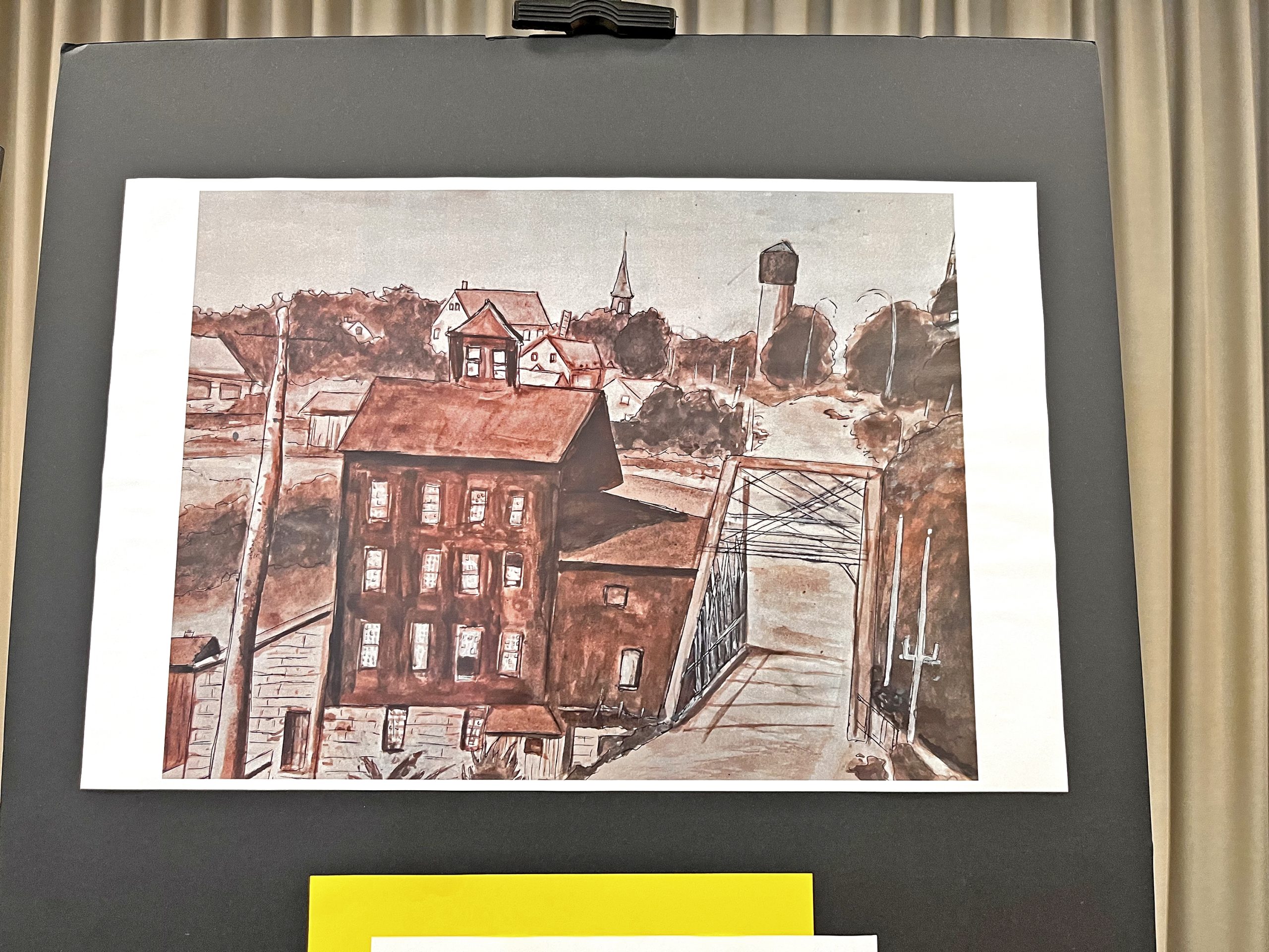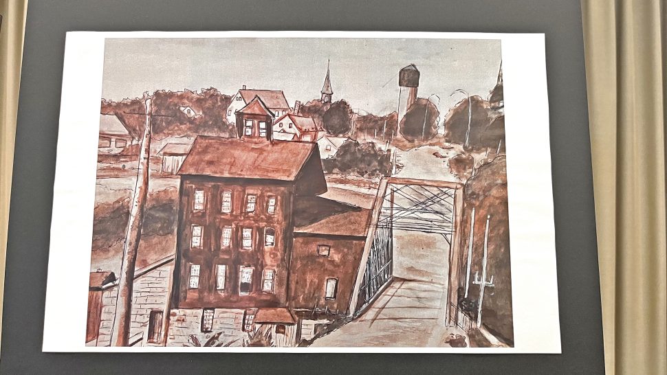 Skorupska used inspiration from a 1913 Mount Forest post card and painted an acrylic and ink rendition of the south end of Mount Forest as it was in 1913, featuring the old iron bridge and Murphy’s Mill.