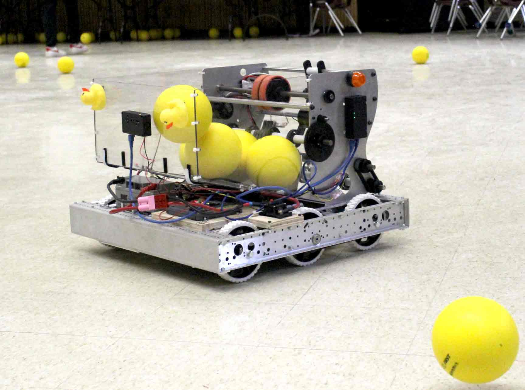 Now they’ve moved on to a far more complicated bot for the First Robotics Competition – this one can pick up balls and toss them into a net, as well as climb a ladder.