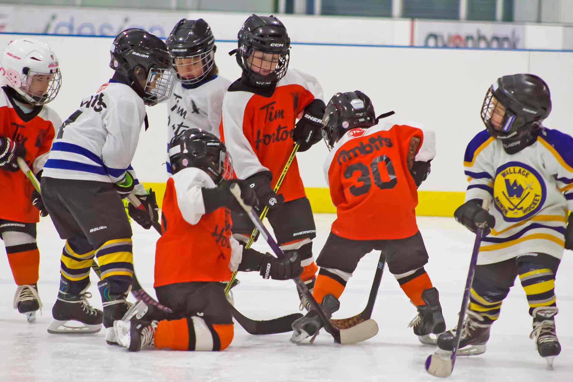 The Wallace U6 and Drayton Black U6 team battle for the puck. Photos by Nicole Beswitherick