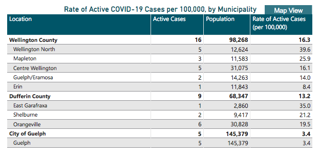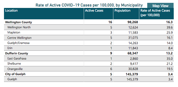 Active cases in Guelph and Dufferin County are sitting at nine and five, respectively.