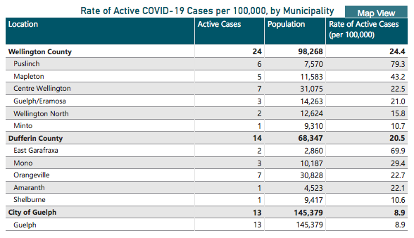 Active cases in Guelph and Dufferin County are sitting at 13 and 14, respectively.