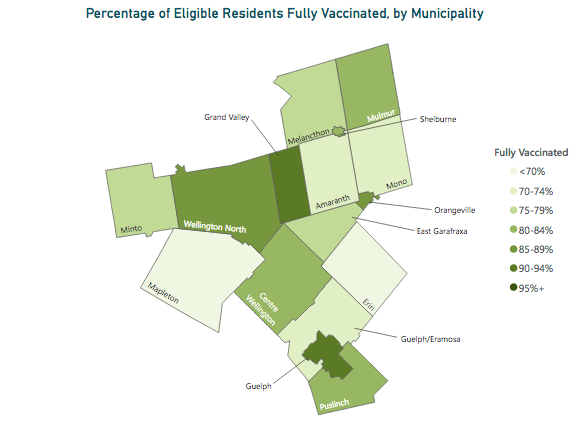 Centre Wellington, with its significantly larger population, still has the largest representation of people vaccinated with between 22,896 and 27,226 residents with two doses (80 to 84%).