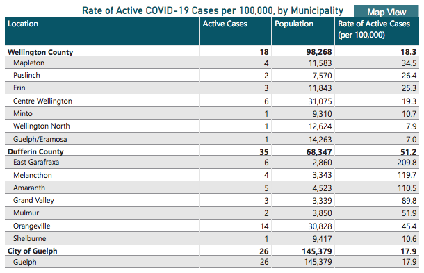 Active cases in Guelph and Dufferin County are sitting at 26 and 35, respectively.