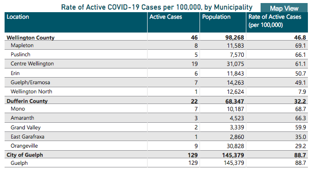 Active cases in Guelph and Dufferin County are sitting at 129 and 22, respectively.