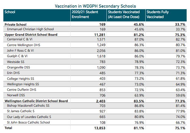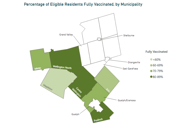 According to WDGPH data tracking vaccination uptake across county municipalities, Centre Wellington has the highest proportion of fully vaccinated residents, with 80-89% of its 27,038 residents having received two doses.