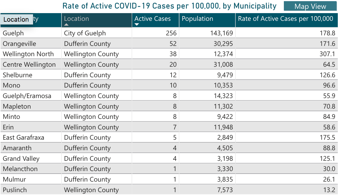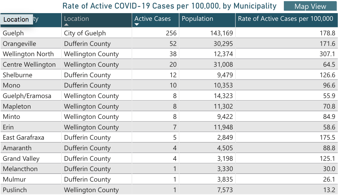 The City of Guelph has the most cases in the region (118 new and 256 active, with three hospitalizations).