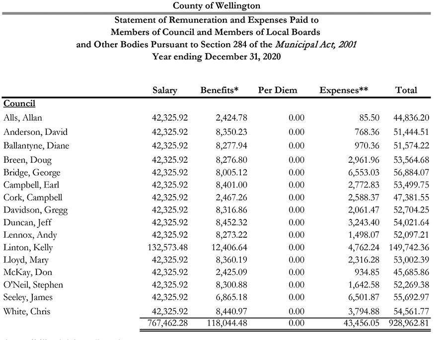WELLINGTON COUNTY – Wages, benefits and expenses paid to the 16 members of Wellington County council totalled $928,962 in 2020, down about $50,788 from 2019.