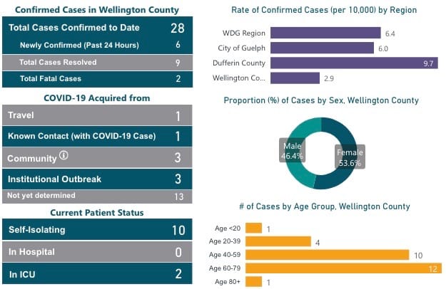 Updated on April 19 just before 11am, the Wellington-Dufferin-Guelph Public Heath (WDGPH) status report shows there are 28 confirmed cases in the county, nine resolved cases and two deaths.