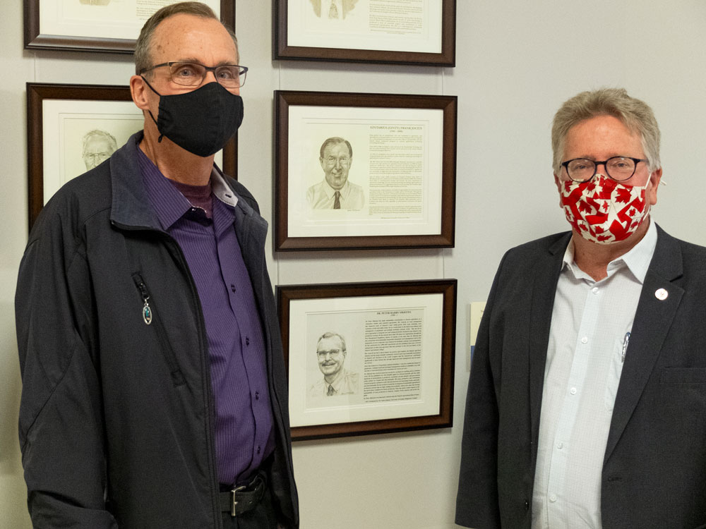 Peter Sikkema, left, and Wellington County Historical Society president Ron Hattle unveil a plaque featuring Sikkema’s portrait and biography of accomplishments and contributions to agriculture. Photo by Jordan Snobelen