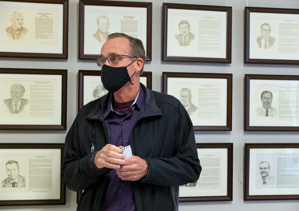 Senator Rob Black speaks in front of rows of plaques hung on a wall at the Wellington County Museum and Archives on Oct. 17. The plaques feature Wellington County residents who have been inducted into the Ontario Agricultural Hall of Fame. Photo by Jordan Snobelen