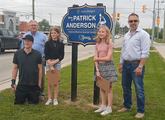 FERGUS – Fergus native and wheelchair basketball star Patrick Anderson came to town on May 20 to unveil a sign that was put up in his honour. The idea for the sign was prompted by three Elora Public School students who presented the idea to Centre Wellington council in February, found a donor for the signs (Print Factor Media in Fergus) and received unanimous approval from council.